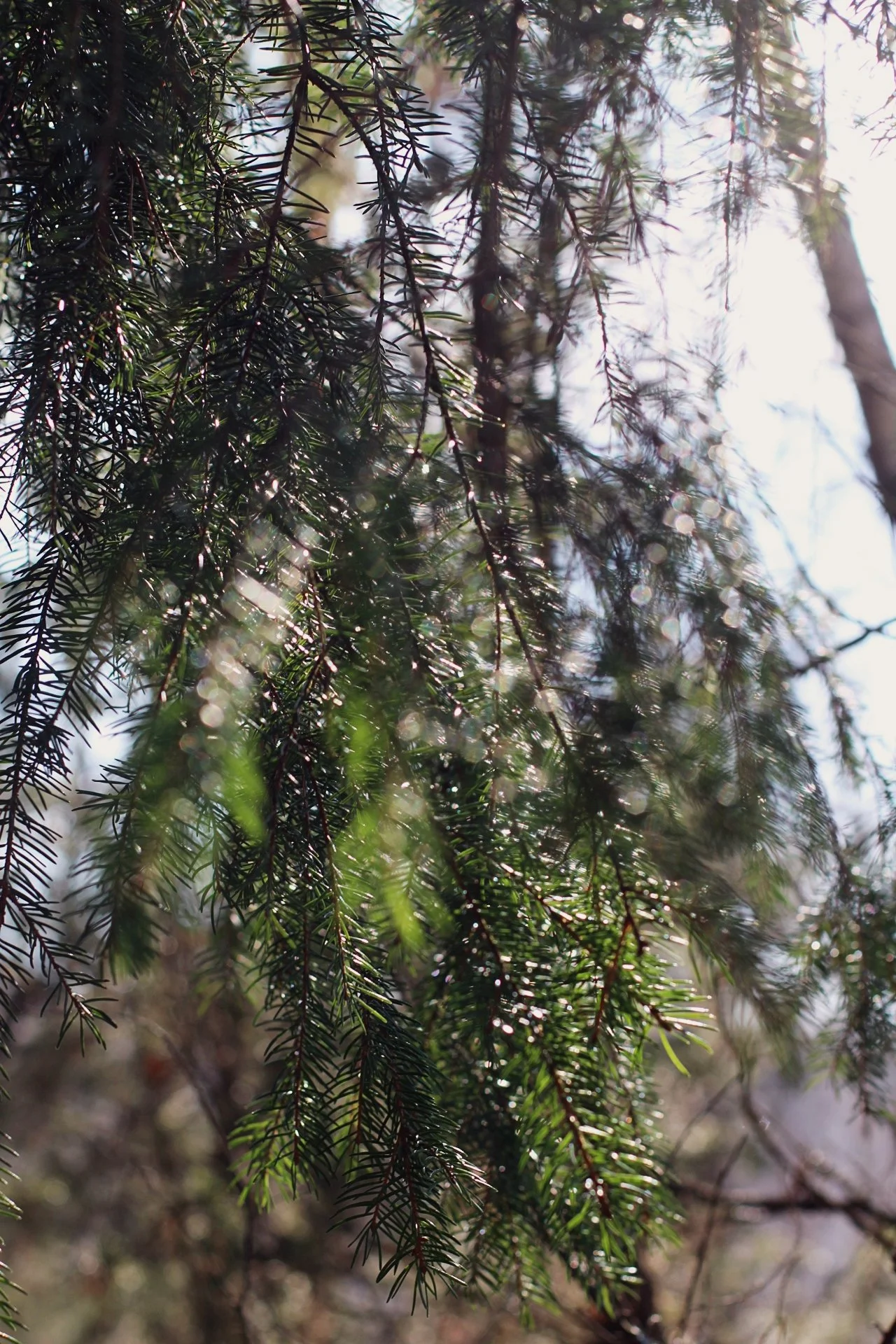 Close-up of pine tree branches with sunlight filtering through the needles.